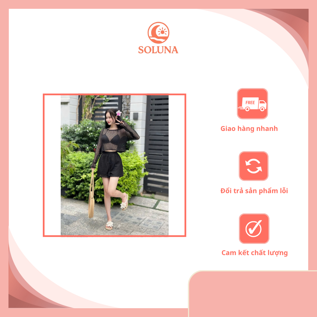 Bộ đồ bơi bikini 3 món, bao gồm áo croptop tay dài, bra tam giác và quần cạp cao 2 lớp.
